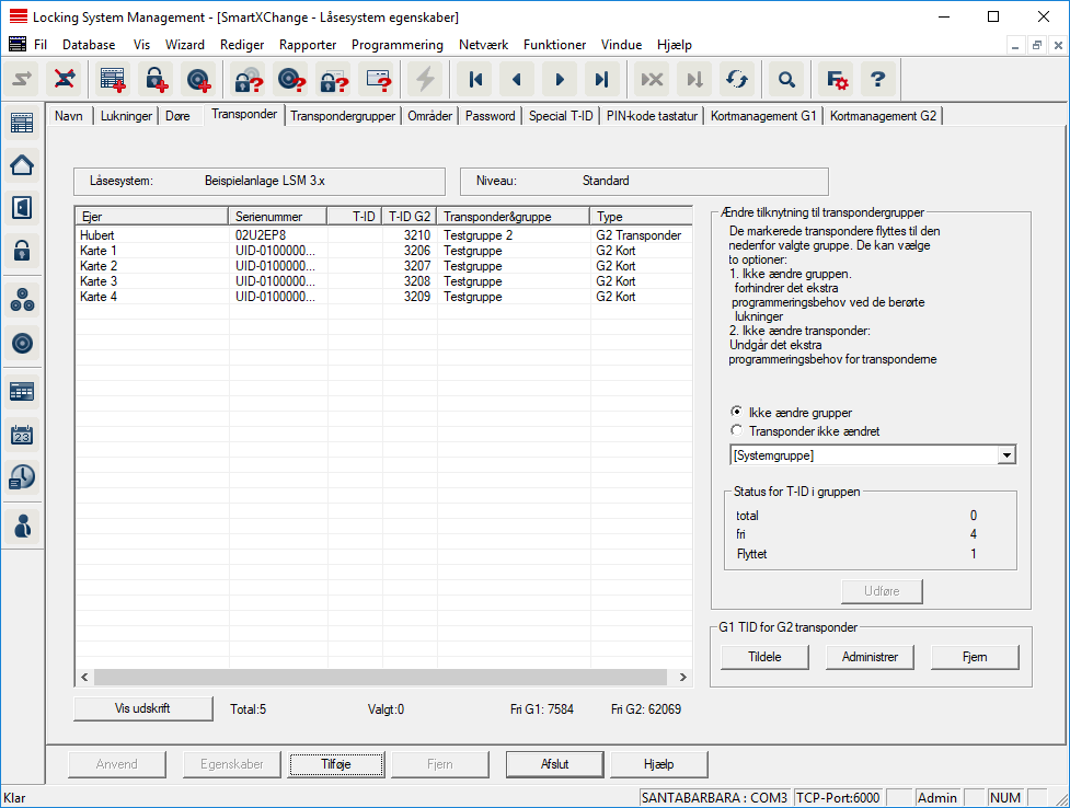 Denne fane skaber et overblik over de i låseanlægget indsatte transpondere. Disse vises alle detaljeret i et skema.