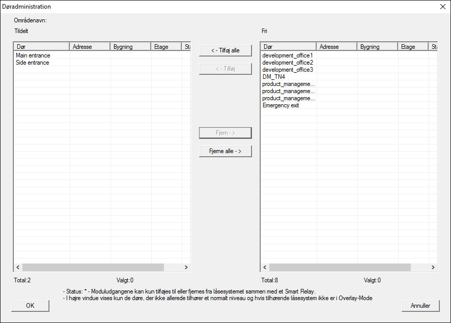- I højre skema vises samtlige lukninger i alle låseanlæg i projektet. Vælg den ønskede lukning via ikonet "Tilføje".