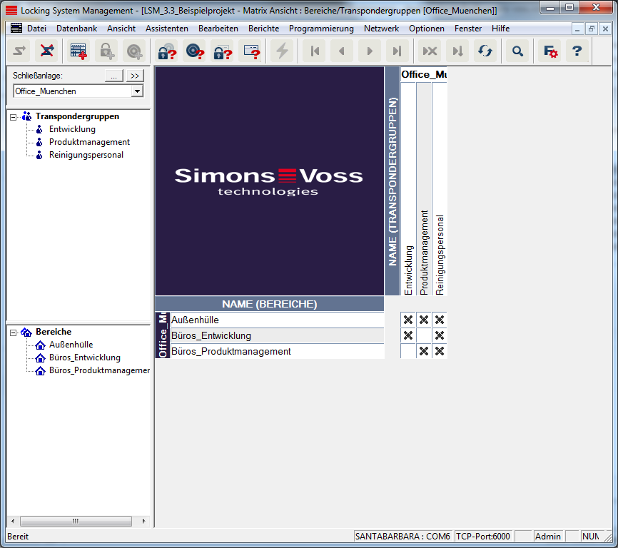 Diese Ansicht bildet eine Matrix, die sowohl die hierarchischen Personal- und Raumstrukturen visualisiert, als auch in der Lage ist, komplette Transpondergruppen gegen komplette Bereiche zu berechtigen. In dieser Matrix wird dadurch das schnelle und einfache Herstellen der Grundberechtigungen ermöglicht. Sollen davon abweichende Berechtigungen in Form von individuellen Erweiterungen oder Einschränkungen vergeben werden, so ist dies in der Ansicht Türen/Personen möglich.