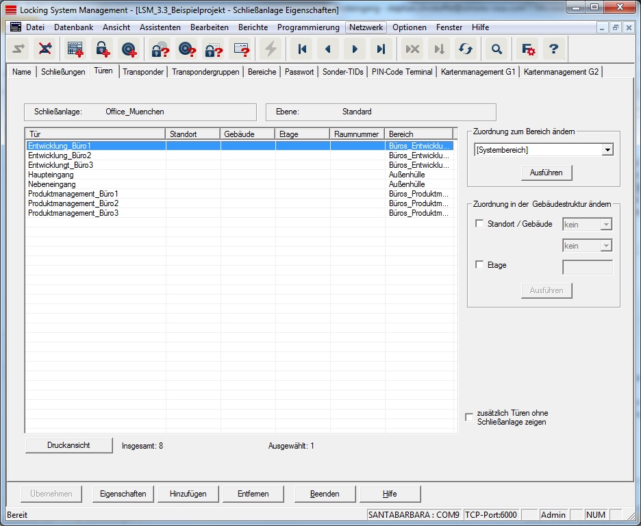 Diese Registerkarte zeigt den Zusammenhang der in der Schließanlage enthaltenen Türen und zugeordneten Bereichen. Diese werden alle detailliert in einer Tabelle angezeigt. Es ist möglich, eine oder mehrere Türen auszuwählen und einem bestimmten Bereich, Standort oder Etage zuzuordnen. Beachten Sie, dass Bereiche, Standorte oder Etagen bereits angelegt sein müssen.
