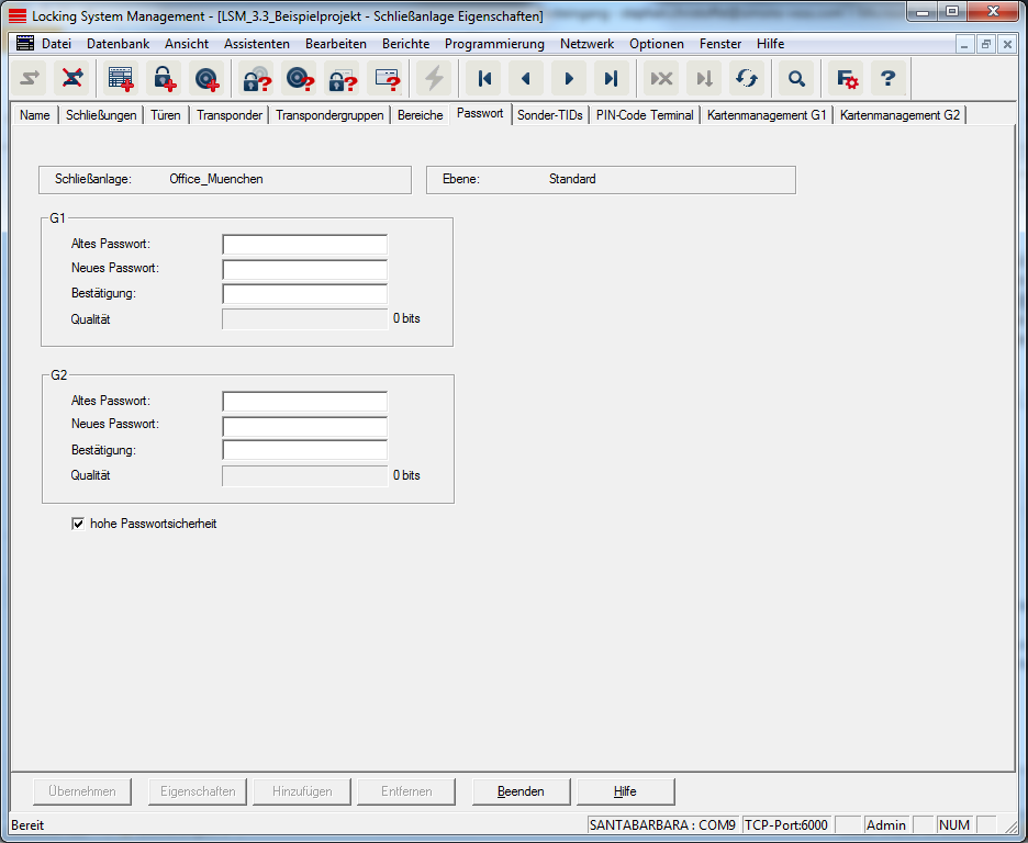 Hier können die Schließanlagenpasswörter, die zur Programmierung der Komponenten verwendet werden, geändert werden.