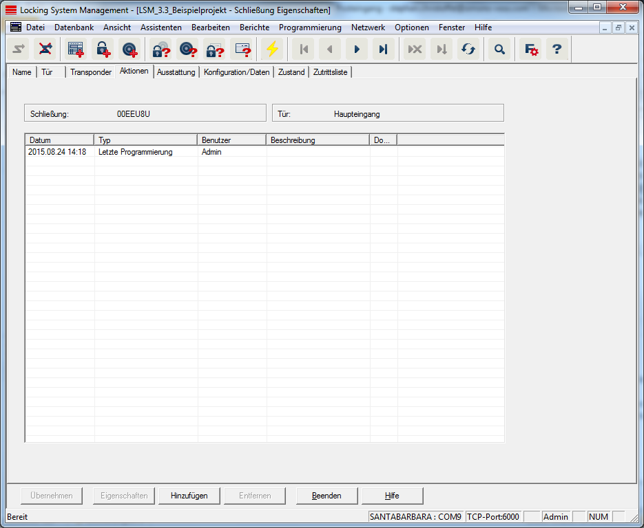 Diese Tabelle zeigt, welche Aktionen (z.B. Programmierung, Berechtigungsänderung, etc.) bei der Schließung durchgeführt wurden. Verschiedene Aktionen, wie z.B. "Letzter Batteriewechsel" lassen sich auch manuell über die Schaltfläche "Hinzufügen" hinzufügen.