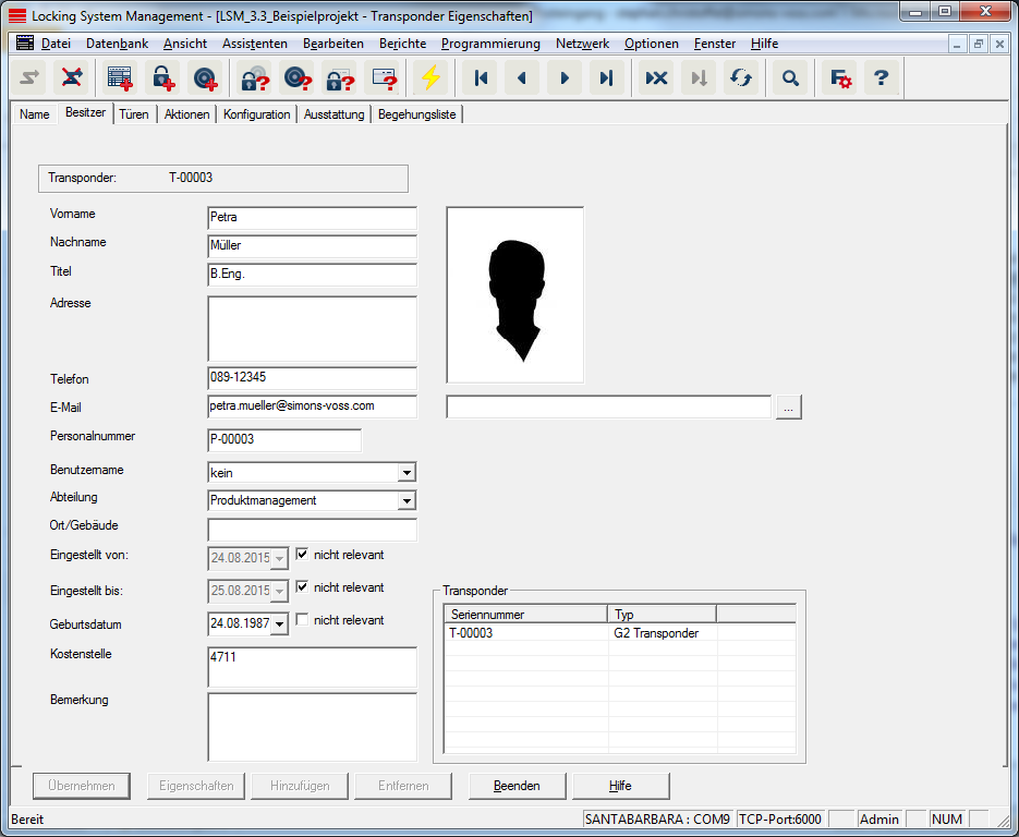 In der Registerkarte "Besitzer" können Sie alle Informationen zum Besitzer des Transponders eintragen. Die Tabelle "Transponder" zeigt, wie viele und welche Transponder dem Benutzer zugeteilt sind. Über die Schaltfläche "..." kann ein Benutzerfoto eingefügt werden. Es werden Bilder vom Typ JPEG empfohlen, die nicht größer als 500 kB sind.
