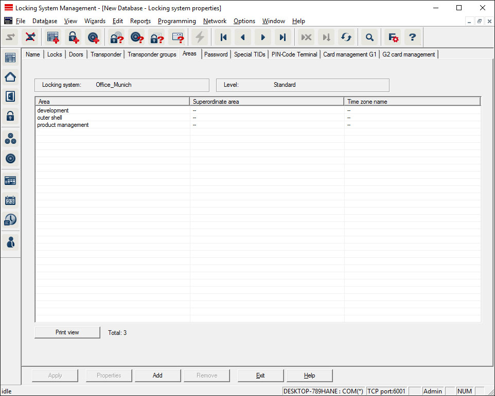 This tab gives you an overview of the areas used in the locking system. The devices are all displayed in detail in a table.