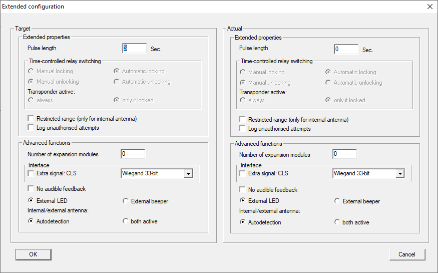 - The right side shows the locking device's current status (Target) – i.e. the status which was last programmed.