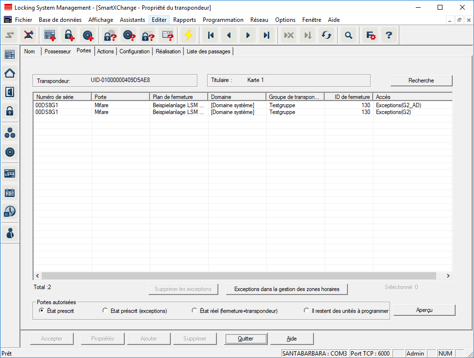 Cet onglet donne un aperçu des autorisations du transpondeur sélectionné aux portes. Ces dernières seront affichées de manière détaillée dans un tableau.