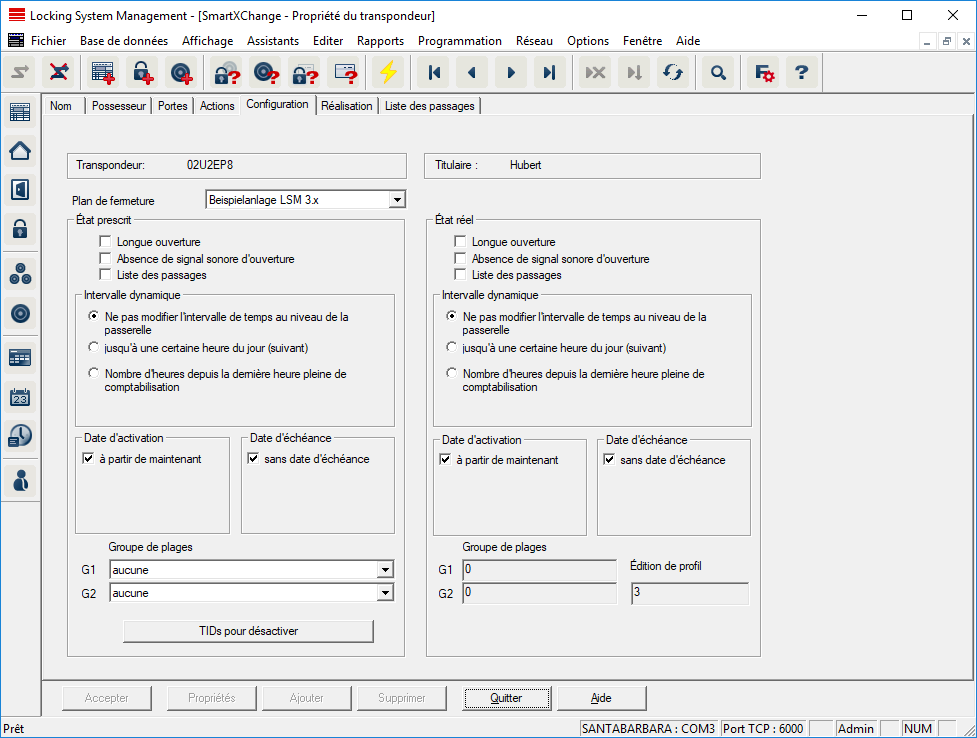 - La page de gauche affiche l'état prescrit du transpondeur et donc l'état voulu et configuré dans le logiciel LSM.