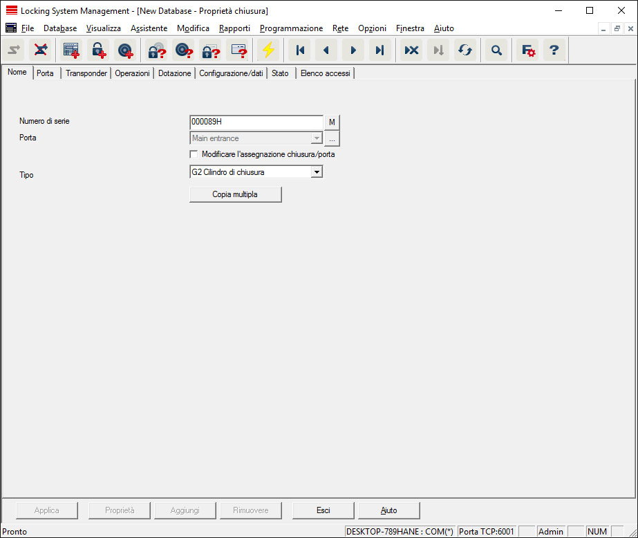 - Mostra il numero di serie della chiusura. Il pulsante "..." mostra le proprietà della porta.