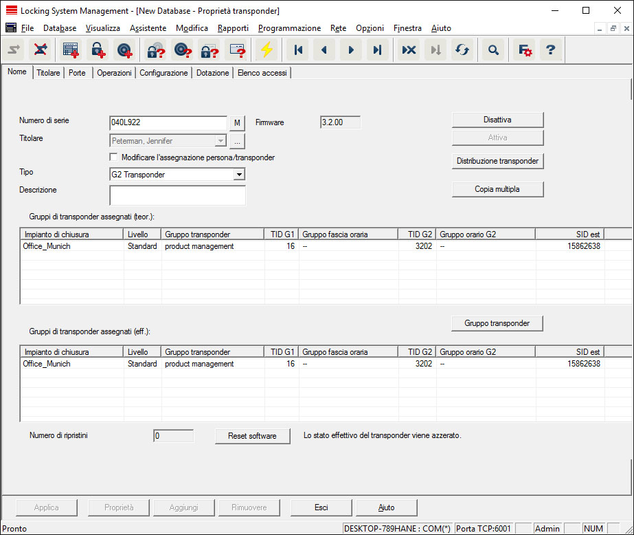 - Numero di serie del transponder. Il pulsante "..." mostra le proprietà della persona. Nel corso della programmazione dei transponder G2, il loro "Numero di serie interno" (numero PHI (Physical Hardware Identifier; stampato sul prodotto)) viene applicato automaticamente.