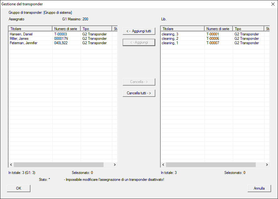 - Nella tabella destra vengono visualizzati tutti i transponder di tutti gli impianti di chiusura del progetto. Selezionare i transponder desiderati con il pulsante "Aggiungi".