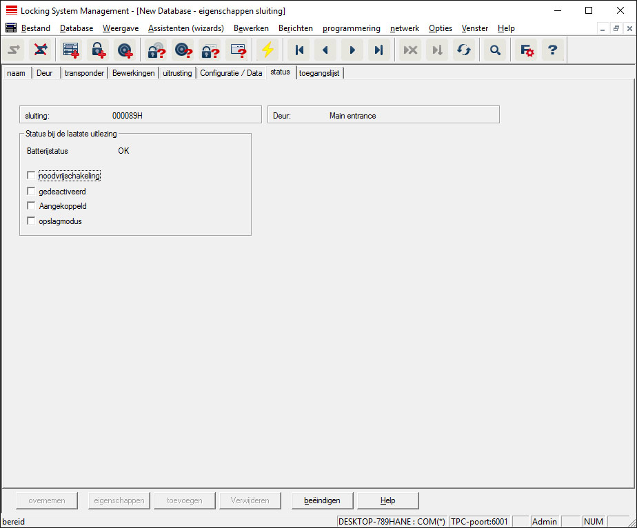 De laatste uitgelezen toestand van het sluitelement wordt aangegeven en elke keer bij het uitlezen ervan geactualiseerd.
