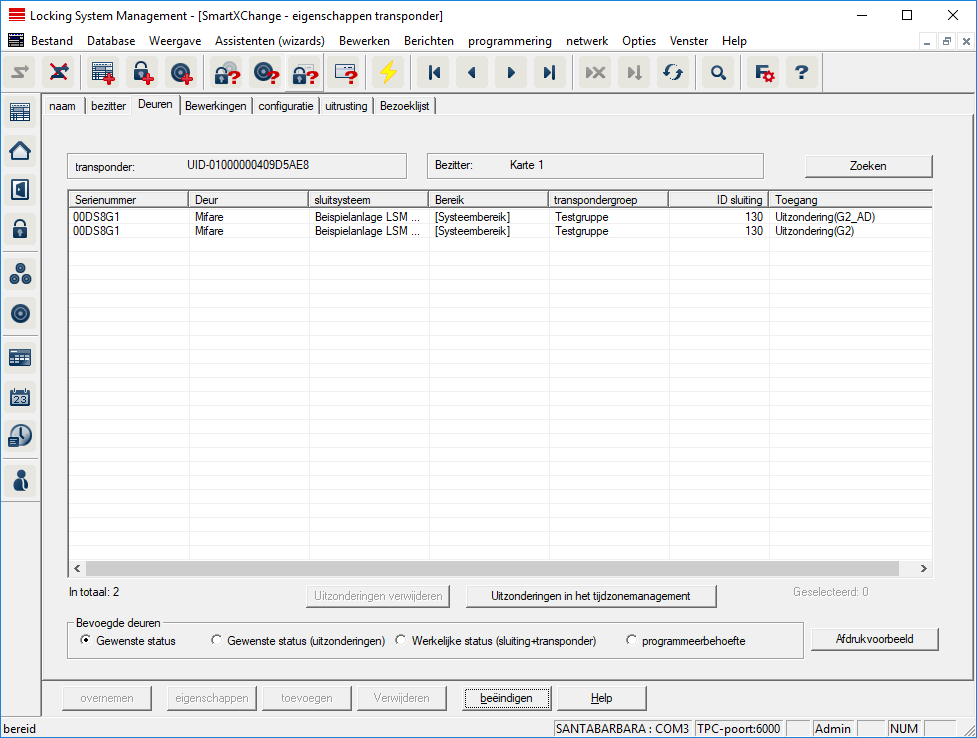 Deze registerkaart geeft een overzicht van de rechten van de geselecteerde transponder bij de deuren. Ze worden allemaal gedetailleerd in een tabel weergegeven.