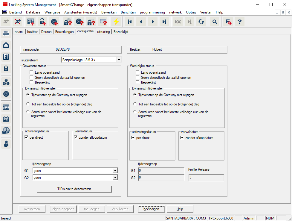 - aan de rechterzijde is de actuele status van de transponder weergegeven – d.w.z. de status die het laatst geprogrammeerd is.