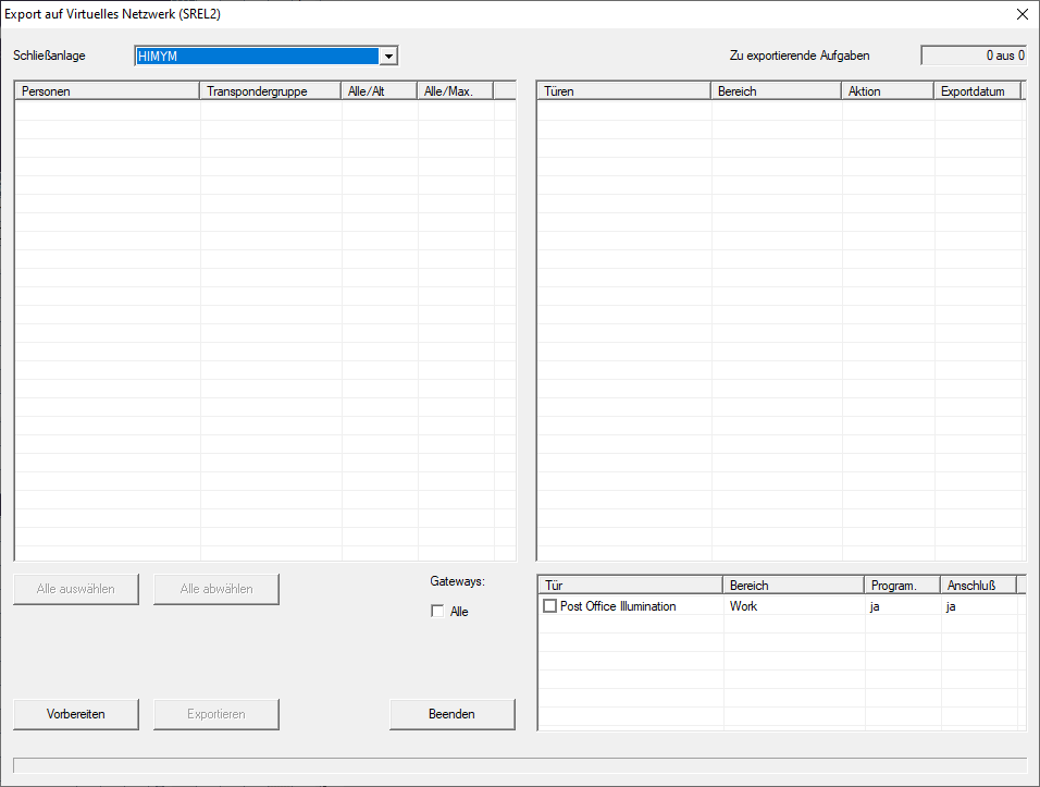 Het exporteren van de wijzigingen van de rechten functioneert alleen wanneer er minstens één wijziging bestaat. Trek als test bijvoorbeeld bij Transponder 1 de rechten voor Cilinder 1 in.