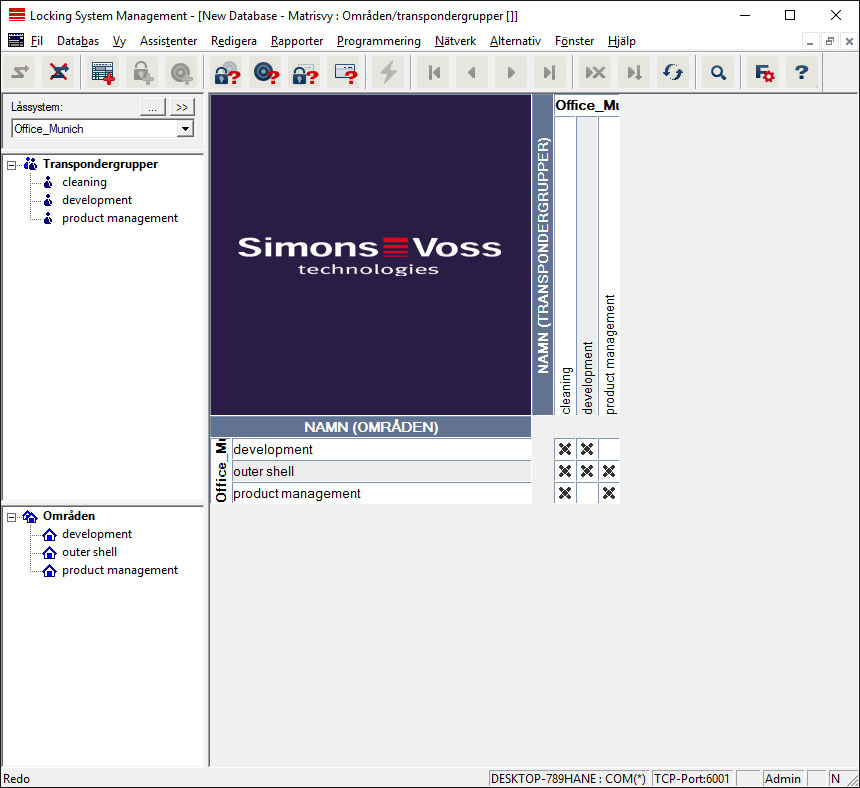Den här vyn bildar en matris som både visualiserar de hierarkiska personal- och rumsstrukturerna och även kan användas för att ge kompletta transpondergrupper behörighet till kompletta områden. Detta gör att man snabbt och enkelt kan upprätta grundbehörigheter i matrisen. Om man vill tilldela avvikande behörigheter i form av individuella utökningar eller begränsningar, görs detta i vyn Dörrar/Personer.