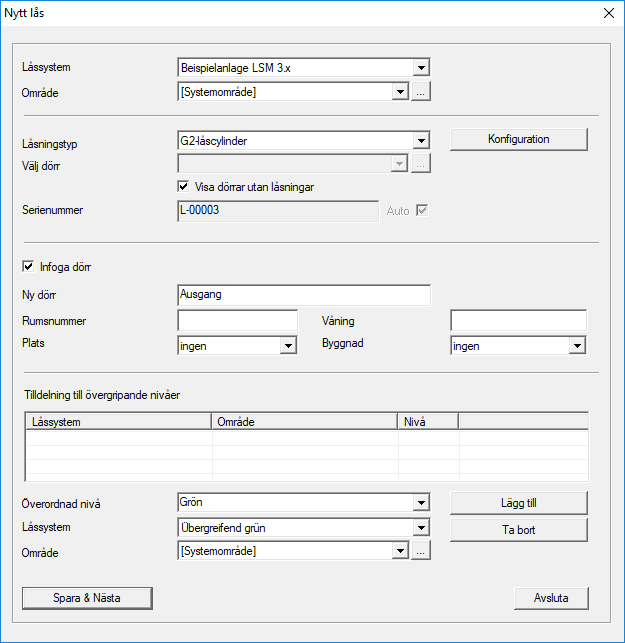 Om flera låssystem och övergripande låsnivåer har skapats kan det nya låset tilldelas dessa direkt. Detta kan göras med hjälp av rullgardinsmenyerna.