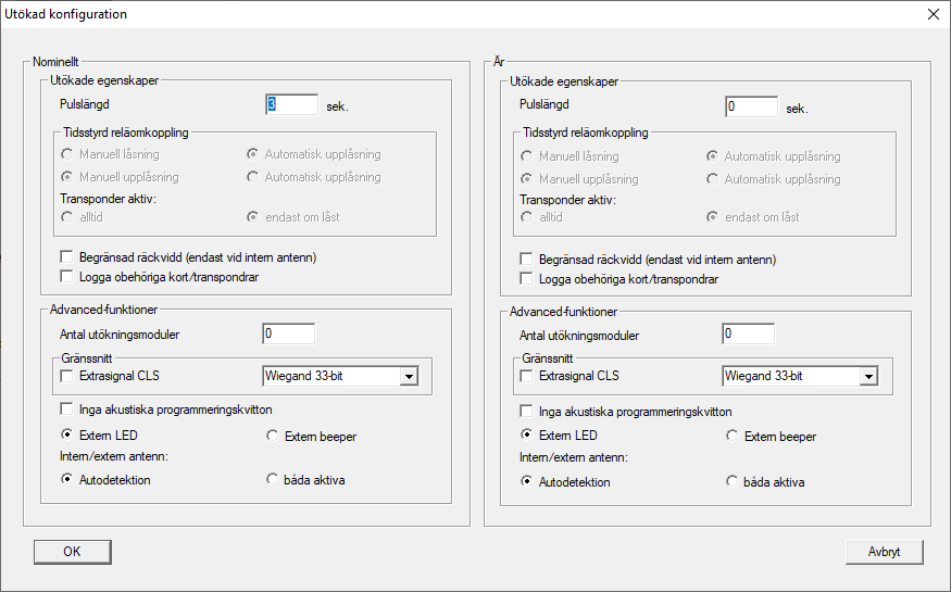 | Endast för SREL.ADV. Många passerkontrolls- och tidsregistreringssystem har seriella gränssnitt för anslutning av kortläsare. Till dessa gränssnitt kan även ett smartrelä anslutas. Därmed kan SimonsVoss-transpondrar användas också i främmande system. Om du önskar att smartreläet överför transponderdata till ett externt system och skickar ett fjärröppningskommando från smartreläet till en cylinder vid aktivering genom det externa systemet, ska detta alternativ väljas både på smartreläet och på cylindern. Typen av externt system ställs in under Grånssnitt. Klicka på knappen Utökad konfiguration. |