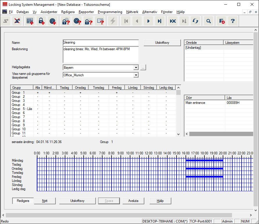 Du ska alltid först skapa ett tidzonsschema och därefter tilldela det till ett område eller ett enskilt lås. Detta kan göras exempelvis via Redigera/Område.