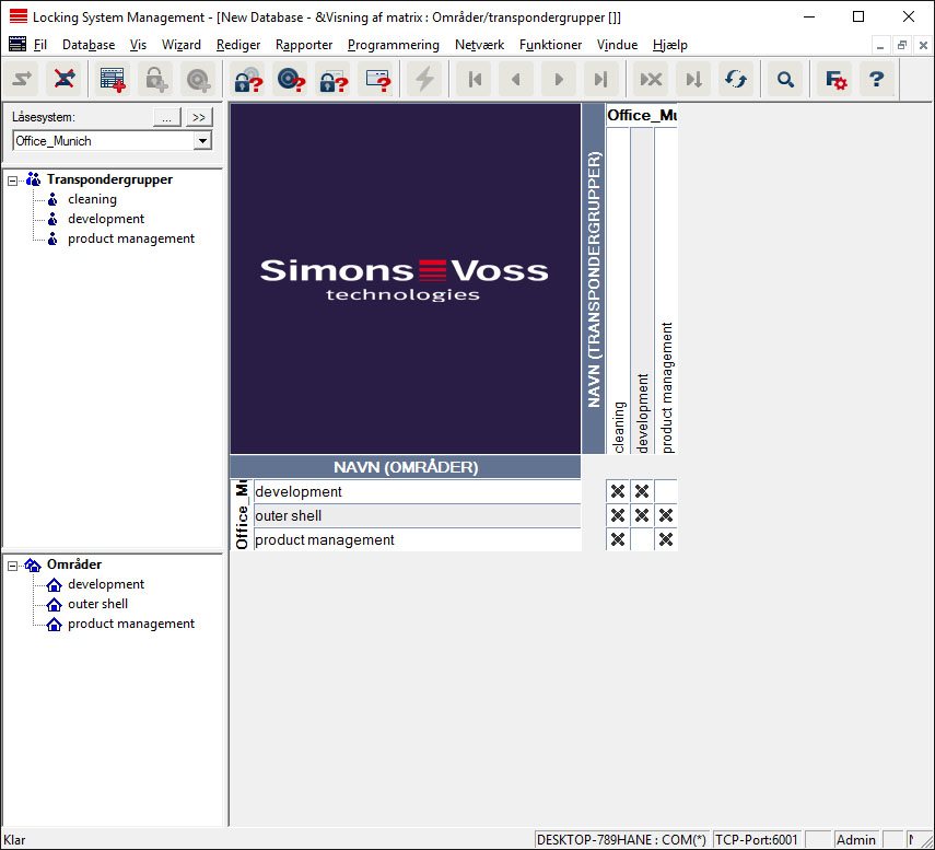 Denne visning udgør en matrix, der både visualiser de hierarkiske personale- og rumstrukturer og også kan berettige komplette transpondergrupper i forhold til komplette områder. I denne matrix er det dermed muligt hurtigt og enkelt og oprette grundlæggende rettigheder. Hvis der derudover er brug for at tildeles afvigende rettigheder i form af individuelle udvidelser eller begrænsninger, kan dette gøres i visningen døre/personer.