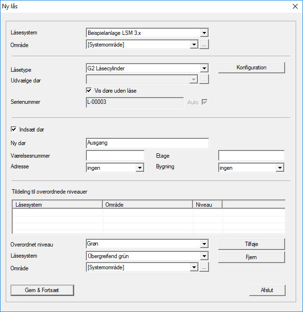 Hvis der allerede er oprettet flere låseanlæg og overordnede låseniveauer, kan den nye lukning tildeles disse direkte. De relevante muligheder vises i form af drow-down menuer.