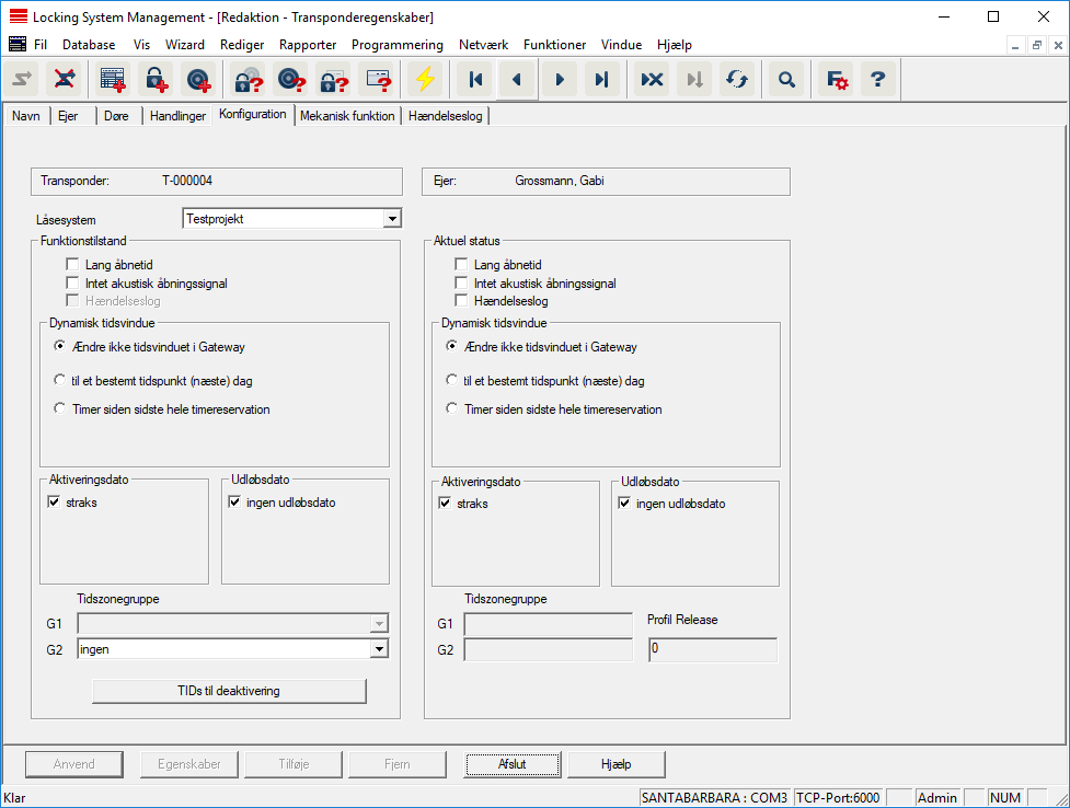 - På højre side vises den aktuelle status for transponderen - altså den tilstand, der senest blev programmeret.