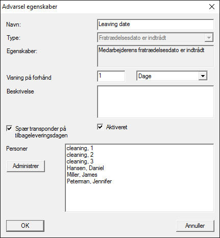 Advarselsfunktionerne tilbyder støtte ved det daglige arbejde med LSM BUSINESS. Man kan støtte sig til dette i bestemte situationer (f.eks. tilbagelevering af transpondere) eller andre hændelser (batteriadvarsel lukning) gennem systemet. Advarslerne vises i advarselsmonitoren ved start af LSM. Advarselsmonitoren åbner sig igen hver 15 minutter.