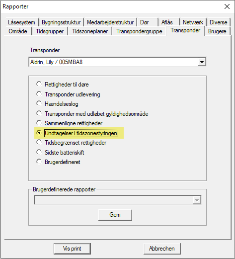 Autorisationer med ignorerede tidsgrupper kan udskrives som en rapport for hvert identifikationsmedie: