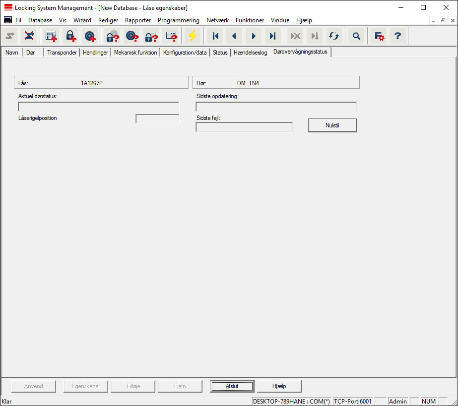 Via fanen "DoorMonitoring status" kan den aktuelle status i lukningen vises i realtid (se også Mulige (dør-)tilstande). Til denne funktioner kræves en konfigureret WaveNet.