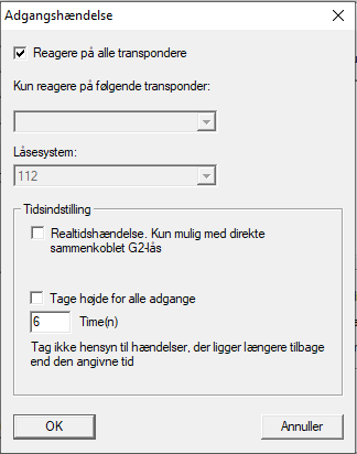 Hændelsen indtræffer, hver gang en transponder aktiveres. Alternativt kan du begrænse hændelsen til en enkelt transponder. - Hvis du bruger hændelsen til direkte netværkstilsluttede låse (WaveNet): Aktivér i området Aktuel statusTidsindstiling afkrydsningsfeltet