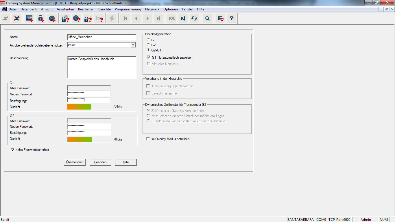 - Legen Sie die Charakteristiken der neuen Schließanlage fest und vergeben Sie sichere Passwörter. Nachträgliche Änderungen sind zu einem späteren Zeitpunkt jederzeit möglich; nach einer Erstprogrammierung der Komponenten aber wegen der entstehenden Programmierbedarfe sehr aufwändig.