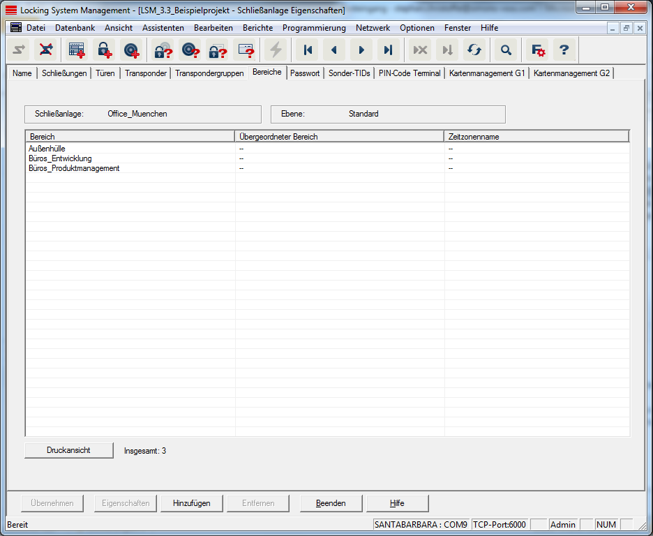 Diese Registerkarte verschafft einen Überblick über die in der Schließanlage eingesetzten Bereiche. Diese werden alle detailliert in einer Tabelle angezeigt.