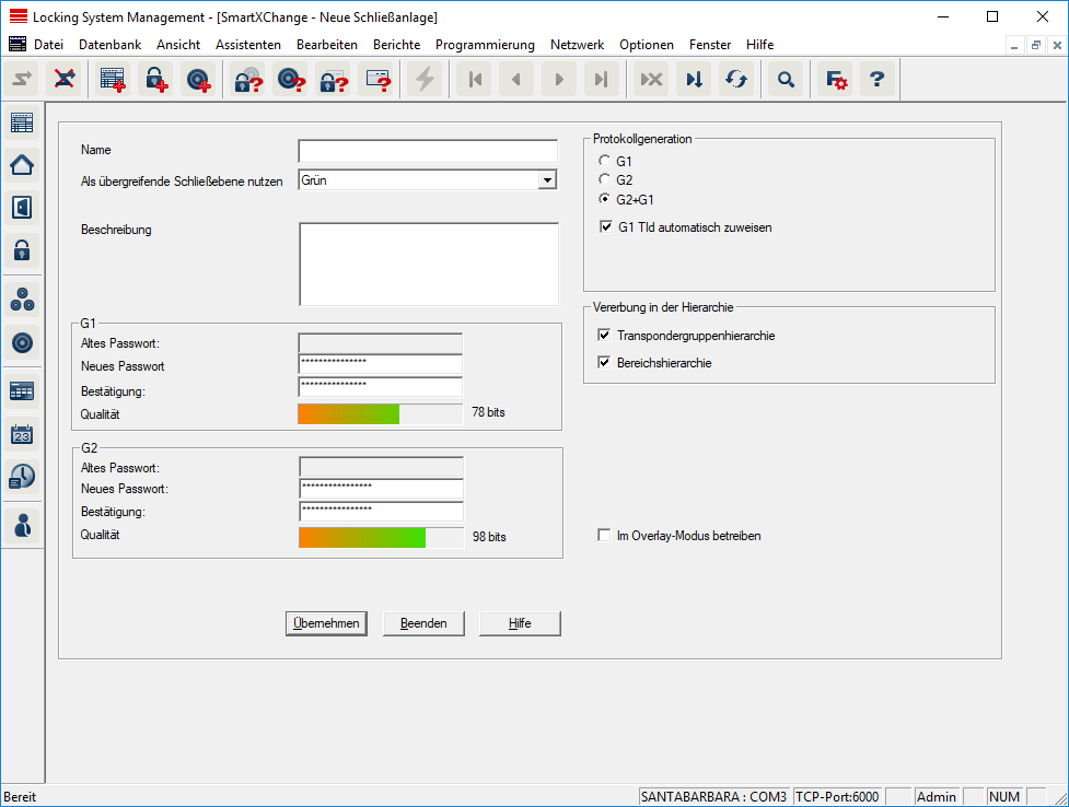 Eine übergreifende Schließebene wird prinzipiell wie jede andere Schließanlage angelegt, z.B. über die Schaltfläche "Neue Schließanlage" in der Symbolleiste: