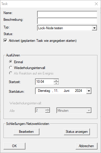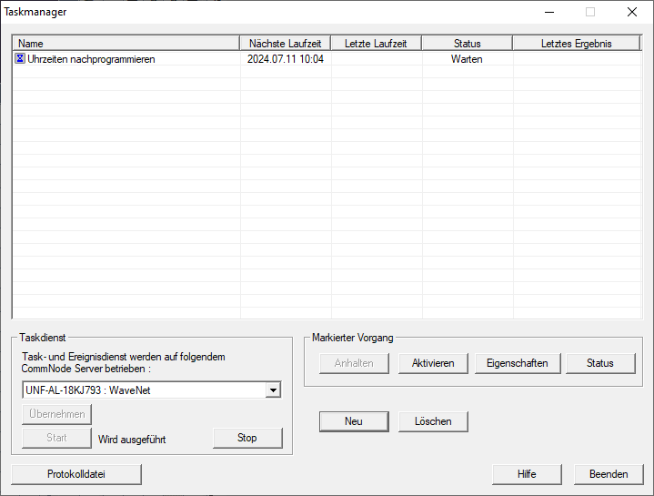 - Wenn Sie den Taskmanager schließen, dann überträgt die LSM die notwendigen Informationen selbst an den eingestellten Kommunikationsknoten (zur Einstellung des Kommunikationsknotens für Task- und Ereignismanager siehe auch Taskdienst einstellen). Danach wird Ihr Task regelmäßig ausgeführt, solange der entsprechende Kommunikationsknoten läuft.