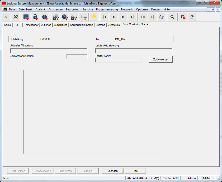 Diese Registerkarte steht nur zur Auswahl, wenn die Schließung die DM-Eigenschaft besitzt und diese in der LSM Software auch direkt als "G2 DoorMonitoring Zylinder/SmartHandle" angelegt wurde! Die Abbildung kann variieren.