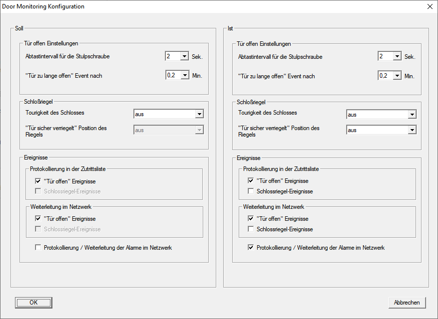 - Aktivieren Sie im Bereich Soll-Ereignisse in den Bereichen Protokollierung in der Zutrittsliste und Weiterleitung im Netzwerk die DoorMonitoring-Ereignisse, die Sie überwachen wollen (z.B.