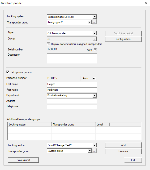If several locking systems and transponder groups have already been created, the new transponder can be assigned to them directly. Drop-down lists provide corresponding options for this purpose.