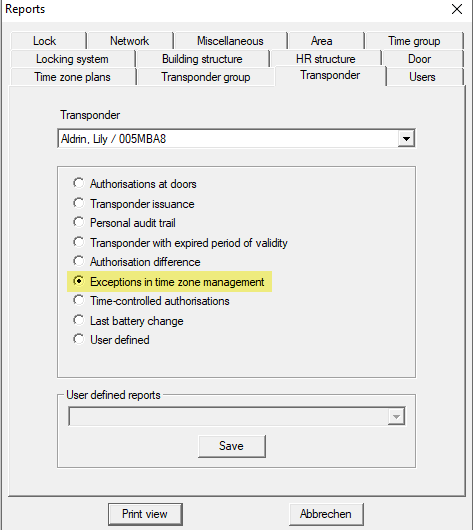 Authorisations with ignored time groups can be generated as a report for each identification medium: