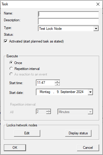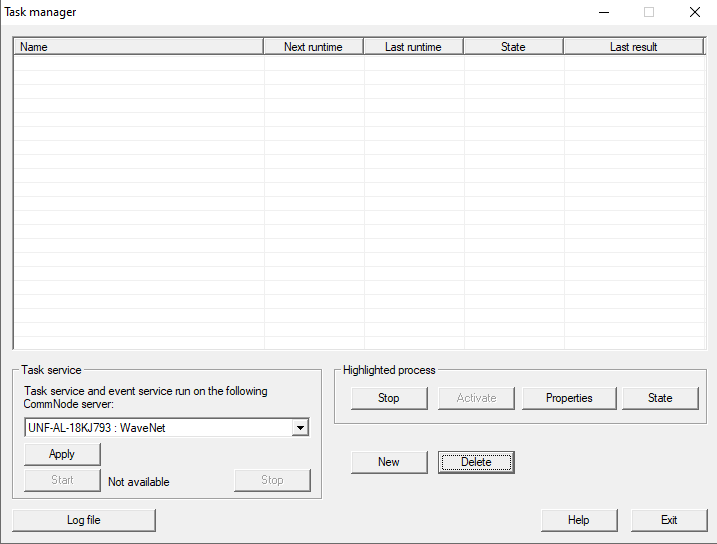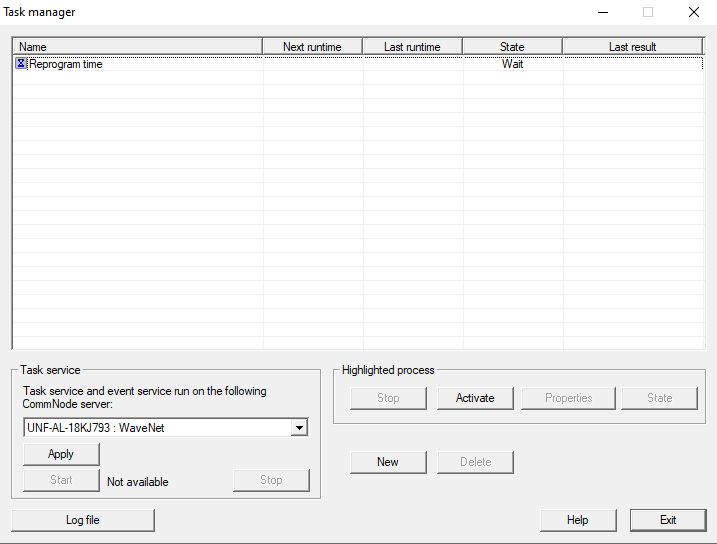 - When you close the task manager, LSM transfers the necessary information to the configured communication node itself (for configuring the communication node for task and event managers, see also Setting up Task services). Your task will then be executed regularly provided the corresponding communication node is running.