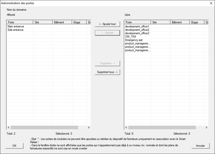- Dans le tableau de droite, toutes les fermetures de toutes les installations de fermeture sont affichées. Sélectionnez les fermetures souhaitées à l’aide du bouton « Ajouter ».