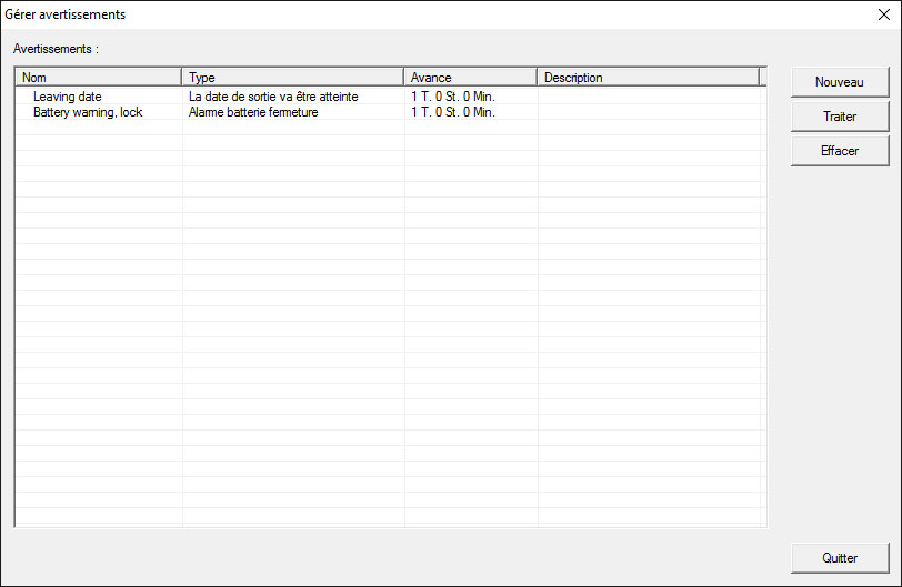 La fonction d’alerte offre une assistance quotidienne dans LSM BUSINESS. Le système peut en effet vous faire part de certaines situations (par ex. une restitution d'un transpondeur) ou d'autres événements (alerte concernant les piles d'une fermeture). Les alertes s’affichent dans l’écran d'alerte lors du démarrage du LSM. L'écran d'alerte s'ouvre toutes les 15 minutes.