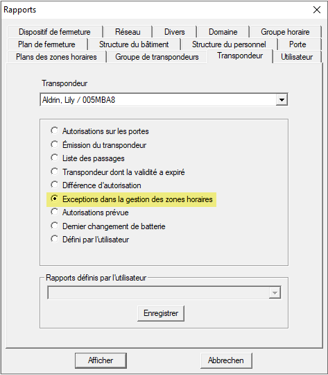 Les autorisations avec des groupes horaires ignorés peuvent être délivrées sous forme de rapport pour chaque support d’identification :