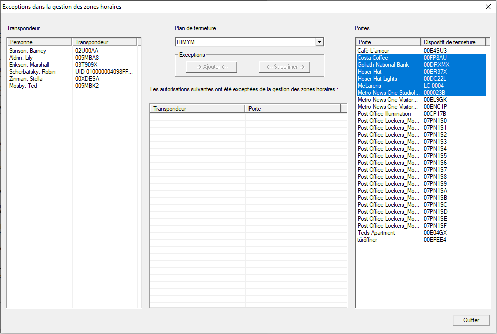 - Dans la zone Portes, sélectionnez les fermetures des autorisations dont le groupe horaire doit être ignoré (sélection multiple possible).