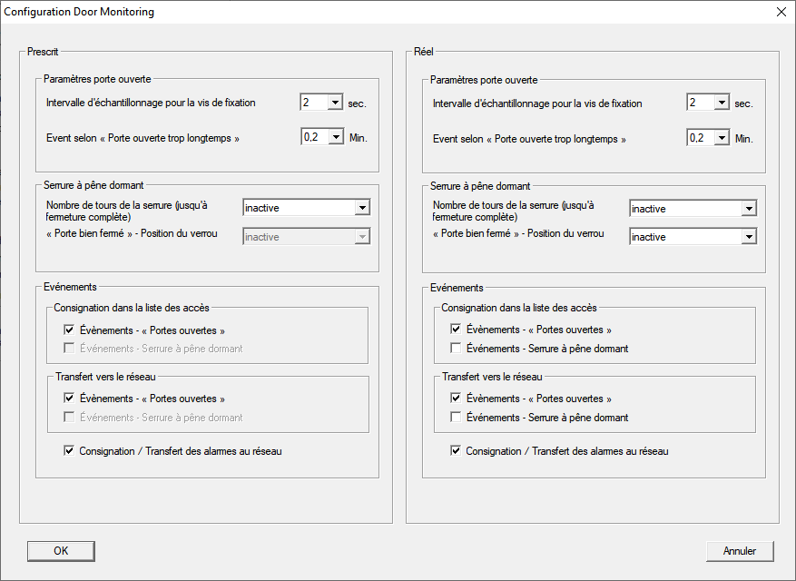Le bouton « Configuration Monitoring » de l’onglet « Configuration données » de la fermeture permet de configurer les fonctions DoorMonitoring du cylindre de fermeture (voir aussi Mise en service du fermeture DoorMonitoring).