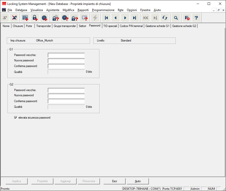 Qui è possibile modificare le password dell'impianto di chiusura utilizzate per la programmazione dei componenti.