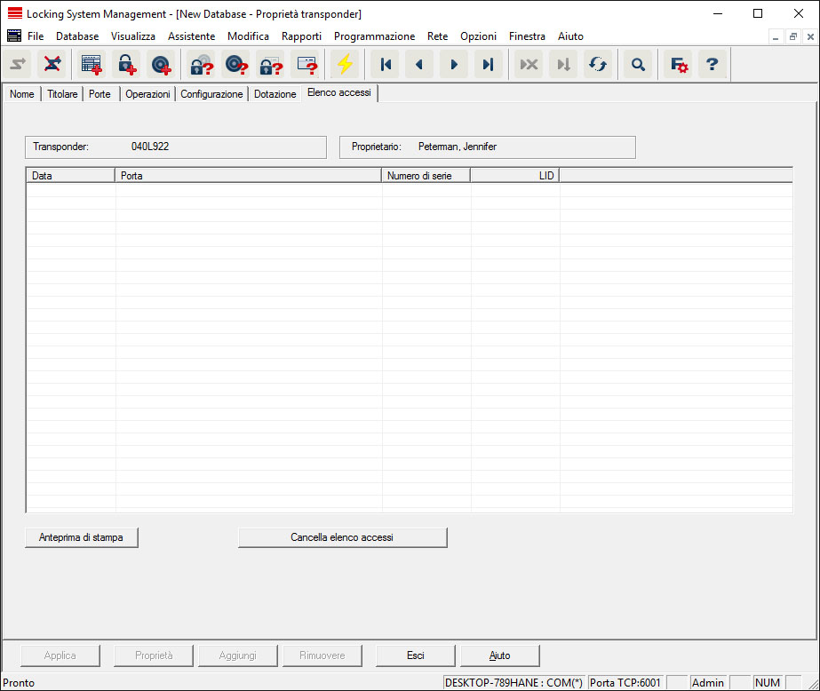 - L'elenco azionamenti viene rappresentato e salvato automaticamente. Ora è possibile visualizzarlo in qualunque momento tramite la scheda Elenco accessi nelle proprietà del transponder.