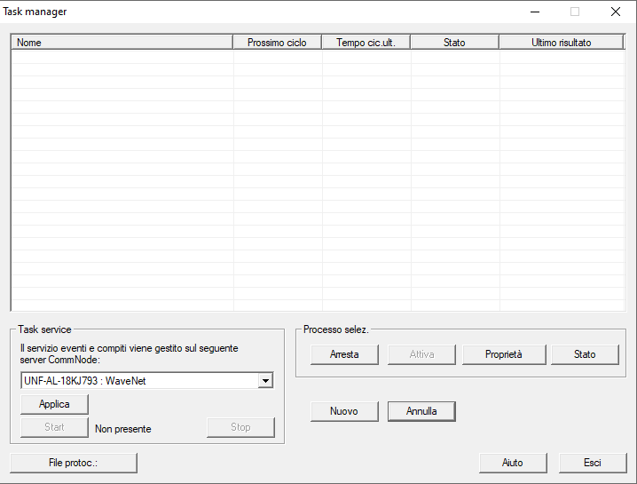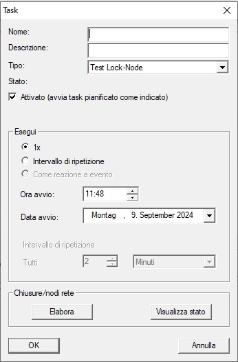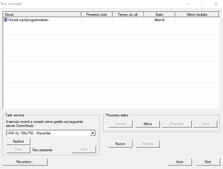 - Una volta chiuso il Task Manager, LSM trasmette in autonomia le informazioni necessarie ai nodi di comunicazione impostati (per l’impostazione del nodo di comunicazione per Task ed Event Manager vedere anche Impostazione del servizio task). Successivamente, il Task sarà eseguito regolarmente, finché il nodo di comunicazione corrispondente resterà in funzione.
