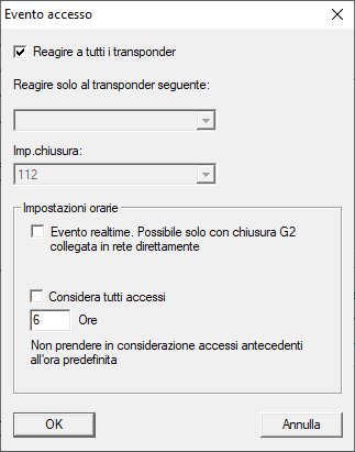 L’evento si verificherà a ogni azionamento del transponder. In alternativa, potete limitare l’evento a un singolo transponder. - Se utilizzate l’evento per chiusure collegate direttamente in rete (WaveNet): attivate nell’area ObbiettivoImpostazioni orarie la casella di controllo
