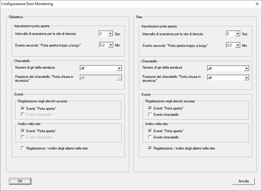 - Attivare nell’area Obbiettivo-Eventi nelle aree Registrazione negli elenchi accessi e Inoltro nella rete gli eventi DoorMonitoring, che si desidera monitorare (ad es.