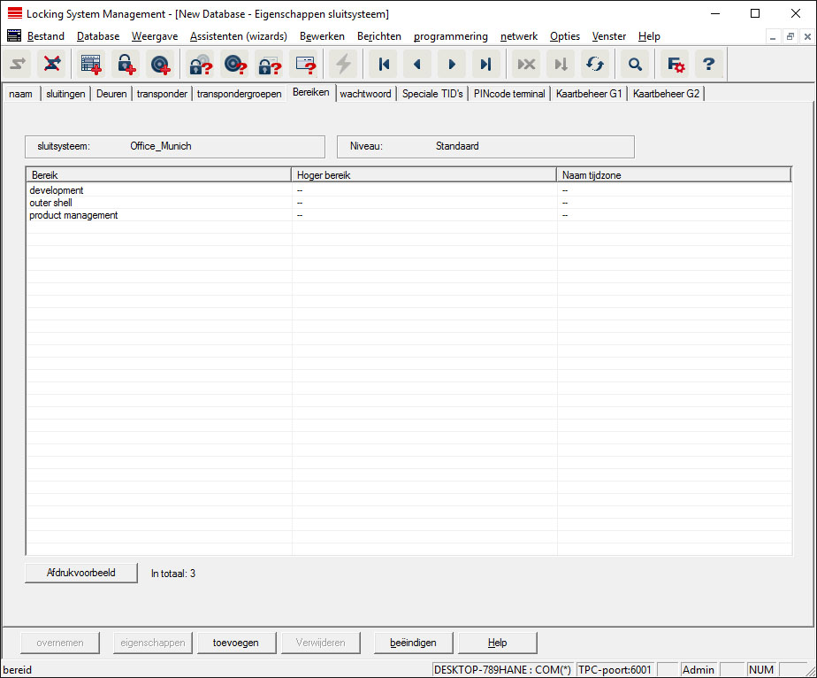 Deze registerkaart geeft een overzicht van de zones die in het sluitsysteem worden gebruikt. Ze worden allemaal gedetailleerd weergegeven in een tabel.