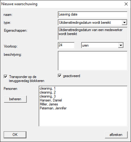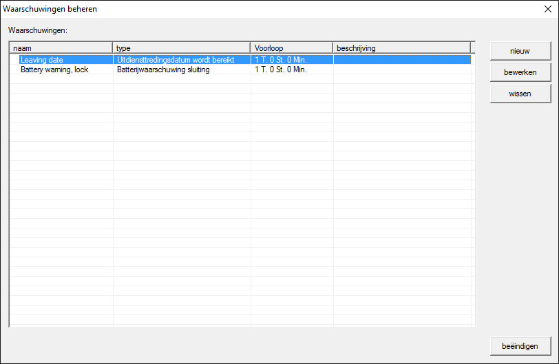 Via de button "Nieuw" kan een nieuwe waarschuwing worden toegevoegd.